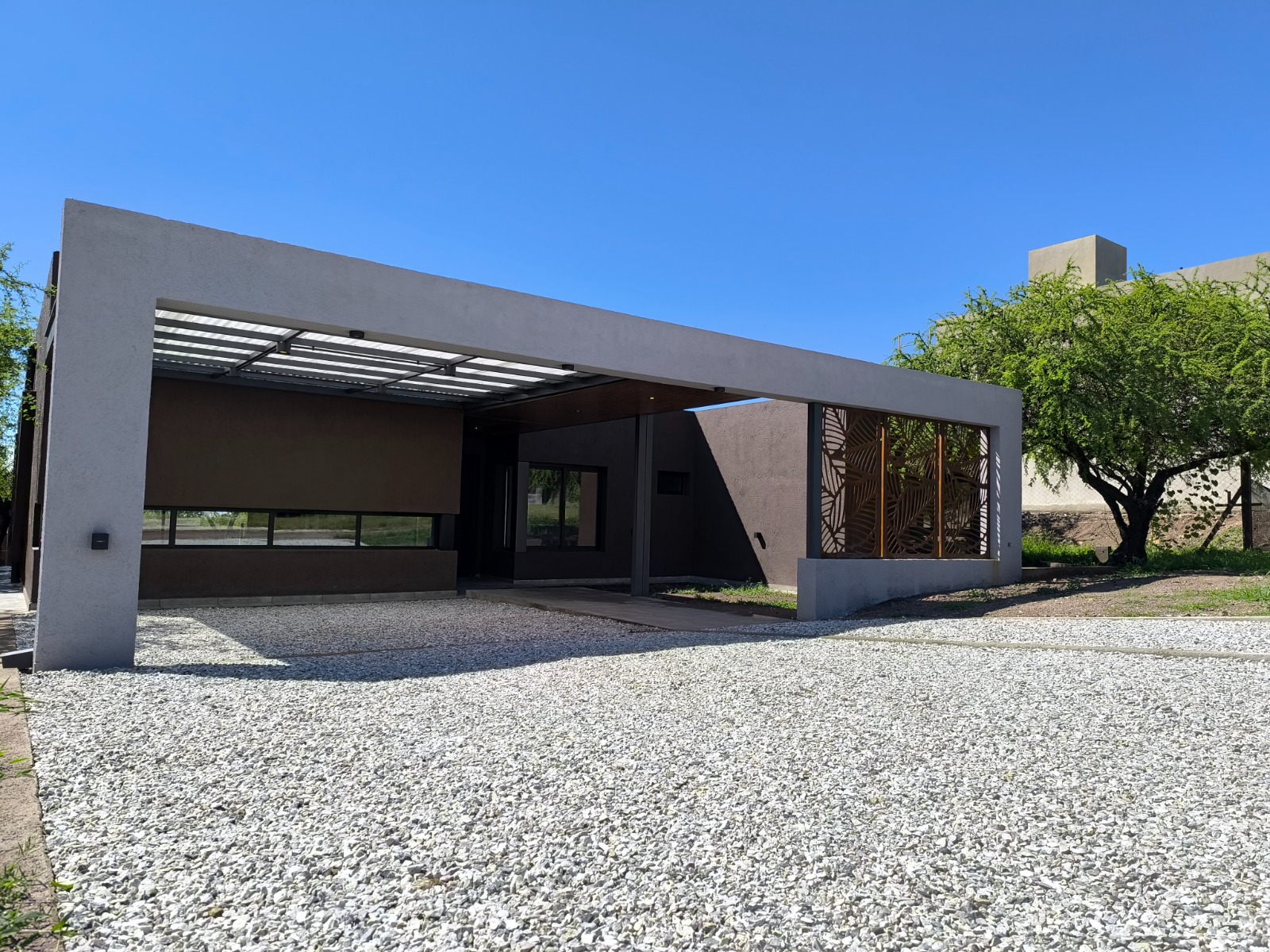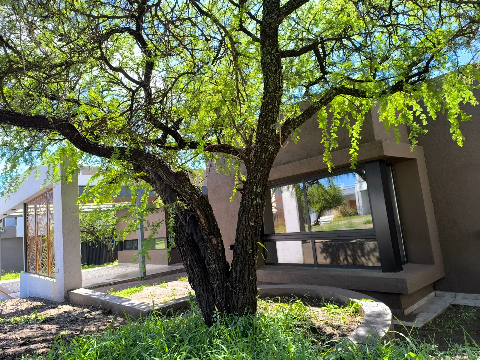 El patio, vinculado a la casa a través de la galería como ámbito de transición, ofrece 260 m² de espacio verde al aire libre, una excelente proporción considerando que la vivienda se desarrolla íntegramente en una sola planta.