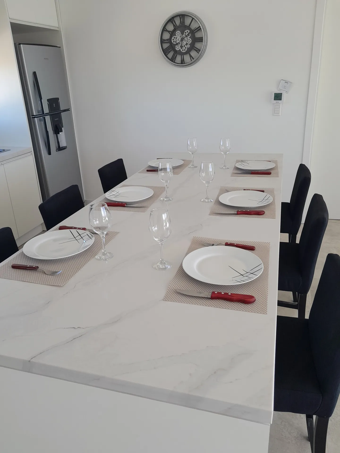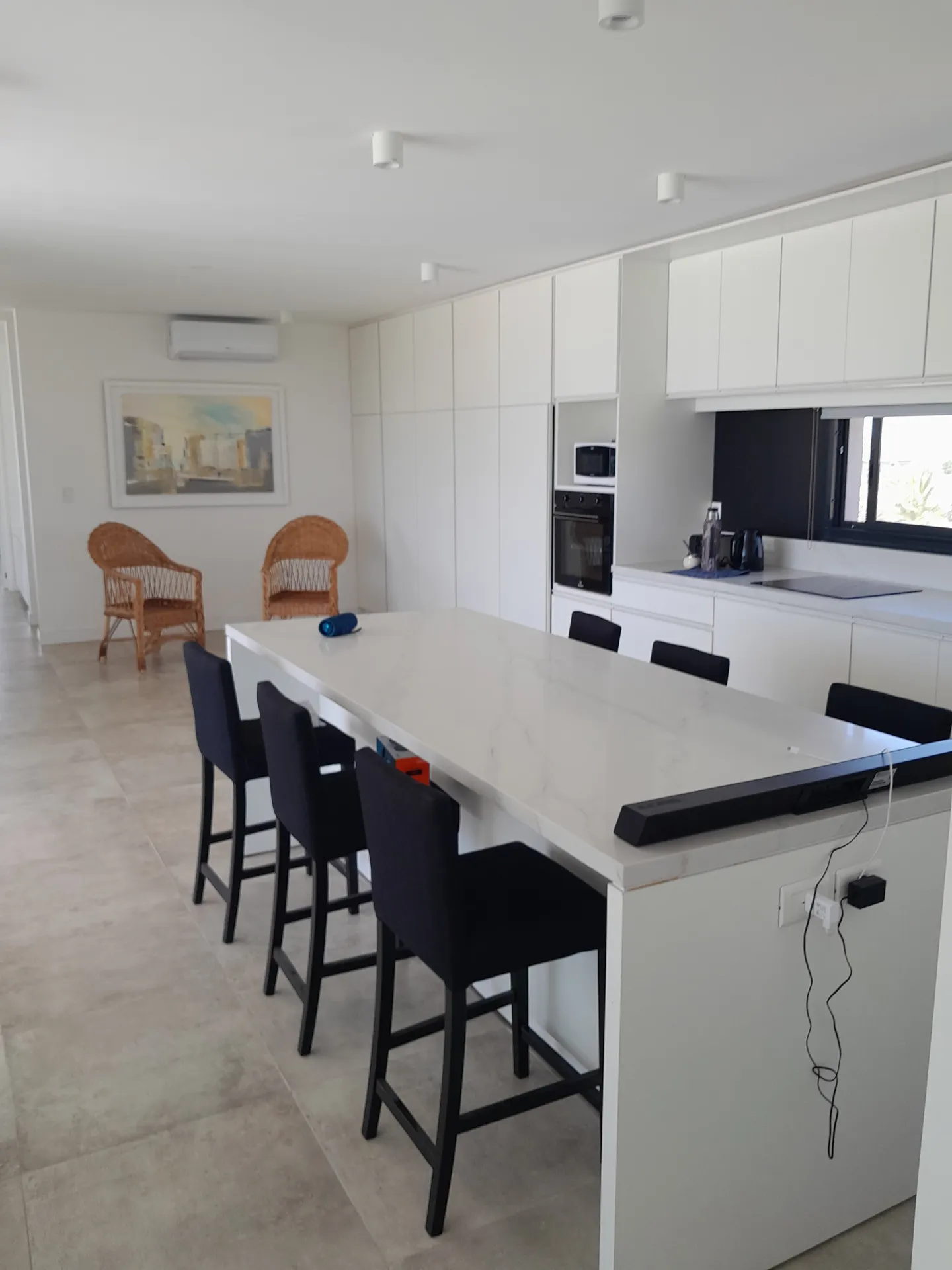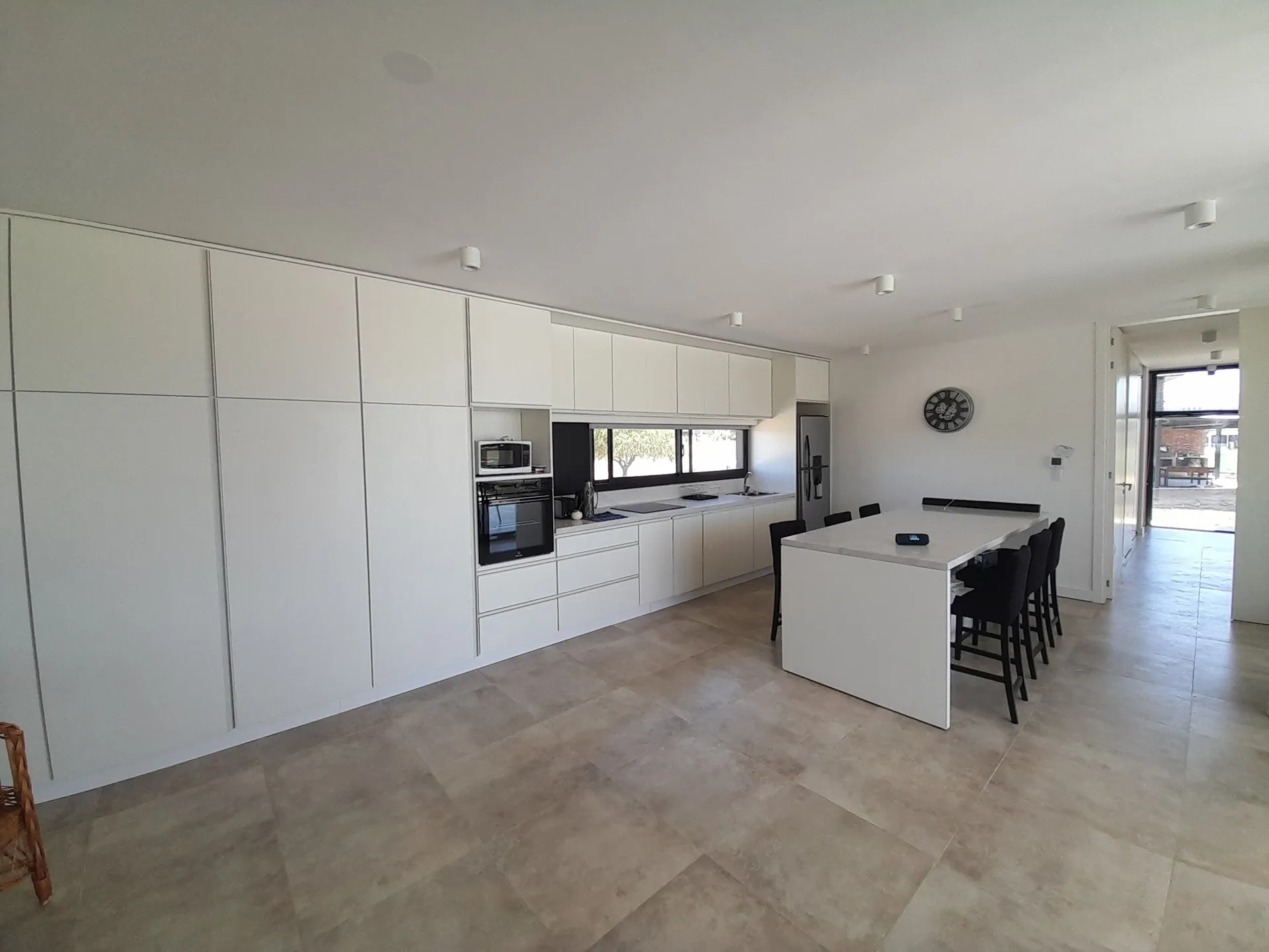 Cocina equipada y presenta mobiliario de líneas rectas, con una isla central que facilita la organización y el uso diario, además de ventanales que aportan iluminación natural y vistas al entorno.