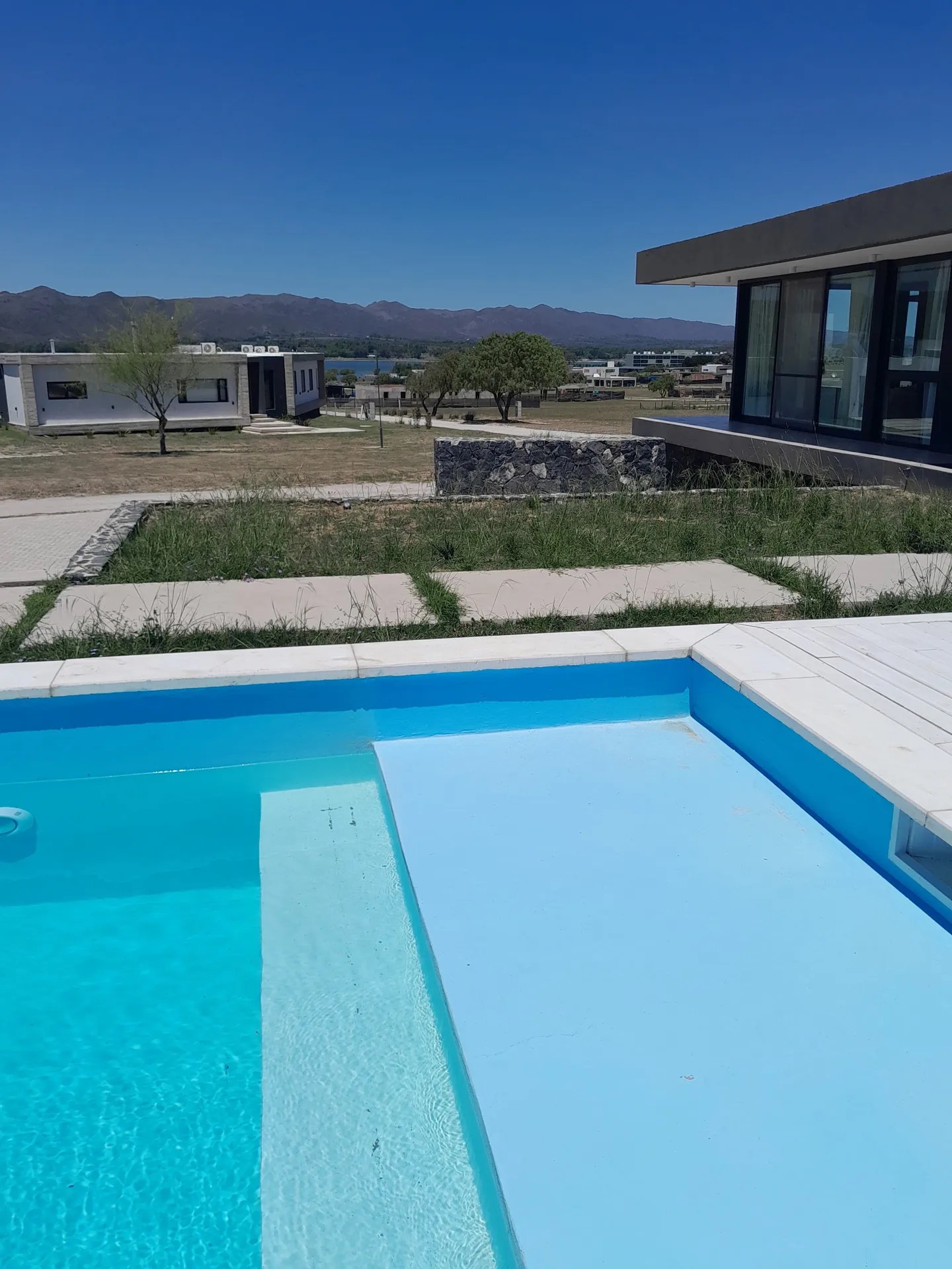 La casa incluye una piscina exterior, rodeada de áreas verdes y senderos pavimentados, ideal para actividades al aire libre.